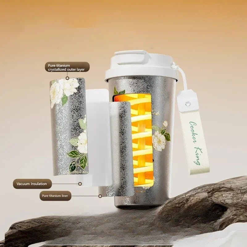 Cooker King 520ML Coffee Cup Flower Pattern, a masterpiece of elegance and functionality for your daily hydration needs. Crafted from pure titanium, this thermos cup offers a unique combination of lightweight feel and exceptional corrosion resistance, ensuring longevity and ease of use.